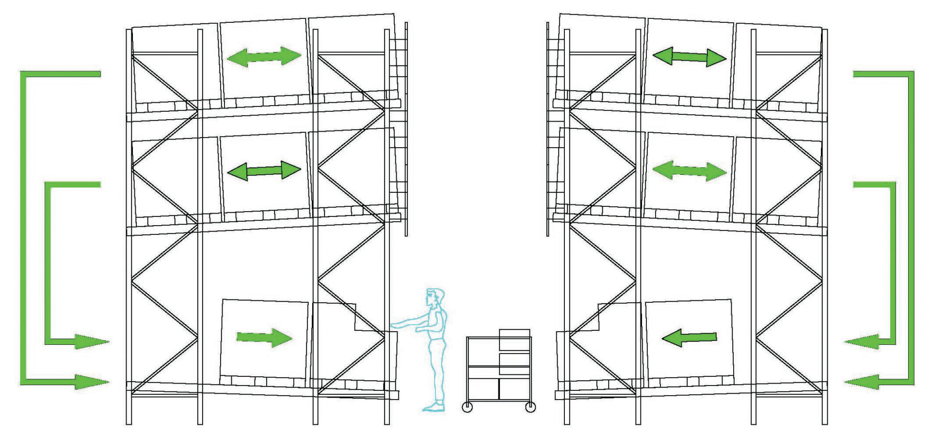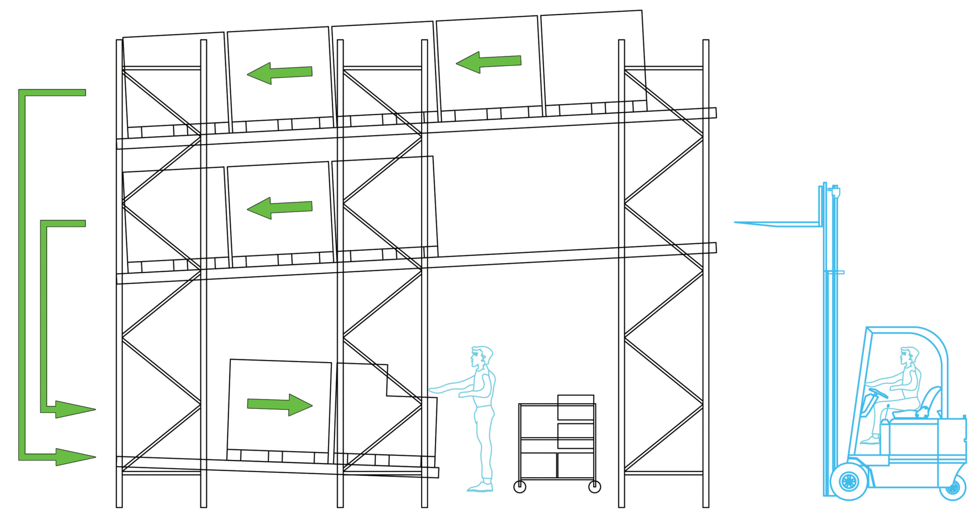 Hệ thống kệ trọng lực là một cấu trúc nhỏ gọn có độ nghiêng nhẹ và băng tải con lăn cho phép các sản phẩm được xếp trên pallet trượt tự do. Khi sản phẩm mới được đặt vào, sản phẩm cũ tự động trượt ra ngoài. Giúp kiểm soát tốt hàng hóa có hạn sử dụng.
